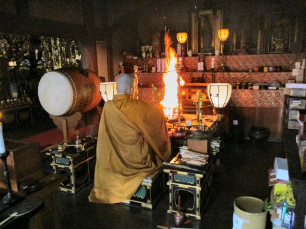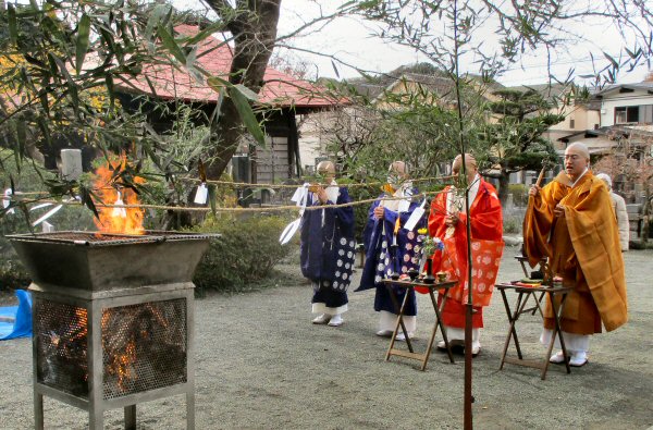 午後2時より境内特設会場でお焚き上げ供養と護摩供が行われました。法要終了後、檀家奉納の大根を世話人が前日より煮炊きしたふろふき大根炊きを病除けとして参加者振る舞い、味わいました。