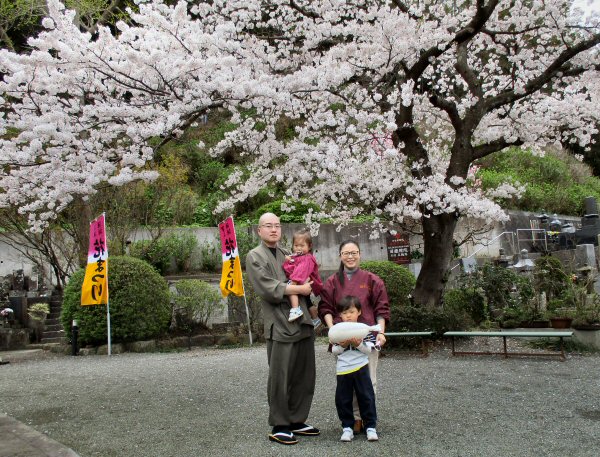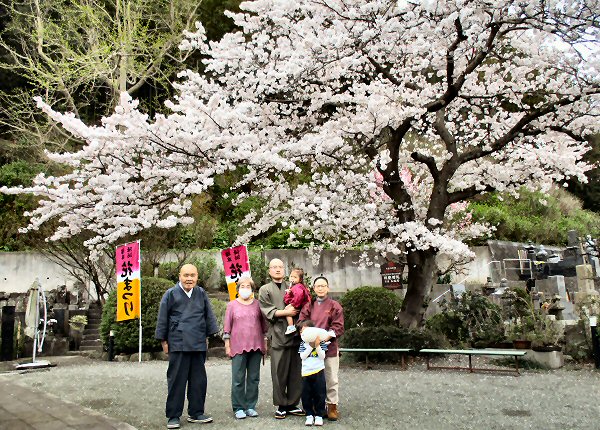 満開の桜の元、𡈽谷副住職の家族