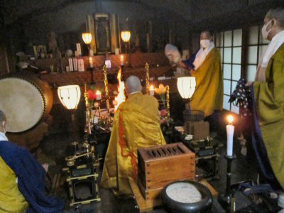 法要には横浜磯子金剛院名誉住職、葉山一色玉蔵院、長柄仙光院、小坪仏乗院各住職、沼間光照寺、仙光院、玉蔵院各副住職が出仕。護摩は東昌寺副住職に4月から就任する。